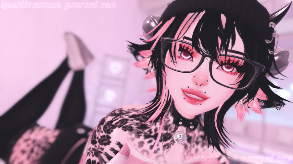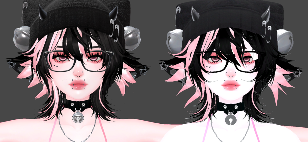 Custom: ♡ Animal: Cat Ears, Tail / Demon Wings, Ears, Horns ♡ Hue Shift: Clothing, Hair, Eyes ♡ Eye Swap Toggle: Human/Cat Eyes ♡ Metal Emission: Make yourself shine bright like a diamond! ♡ Color Swap: Hoodie x2, Sweater x2, Underwear x2, Corset, Socks, Garters, Metals, Collar, Beanie, Sleeve, Skirt ♡ Lighting Adjustment Toggle:Locally make yourself brighter in dark worlds! ♡ Contacts: Headpat, Eye Poke Left & Right, Nose Boop, Kiss, Bell w/ sound (all are toggleable on/off) ♡ Skin Tone Slider: Pale → Tan → Black → Tattoo → Plain (Pale Only)